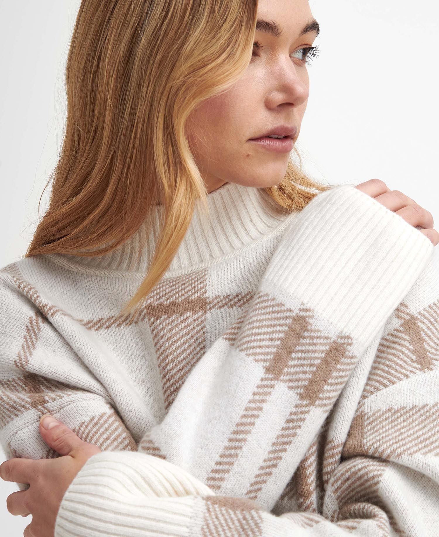 Barbour Deanna High Neck Jumper er inspireret af Barbours tradition ved den skotske grænse i Dumfries og kan prale af en overdimensioneret jacquard-skotsktern, som et statement-look.