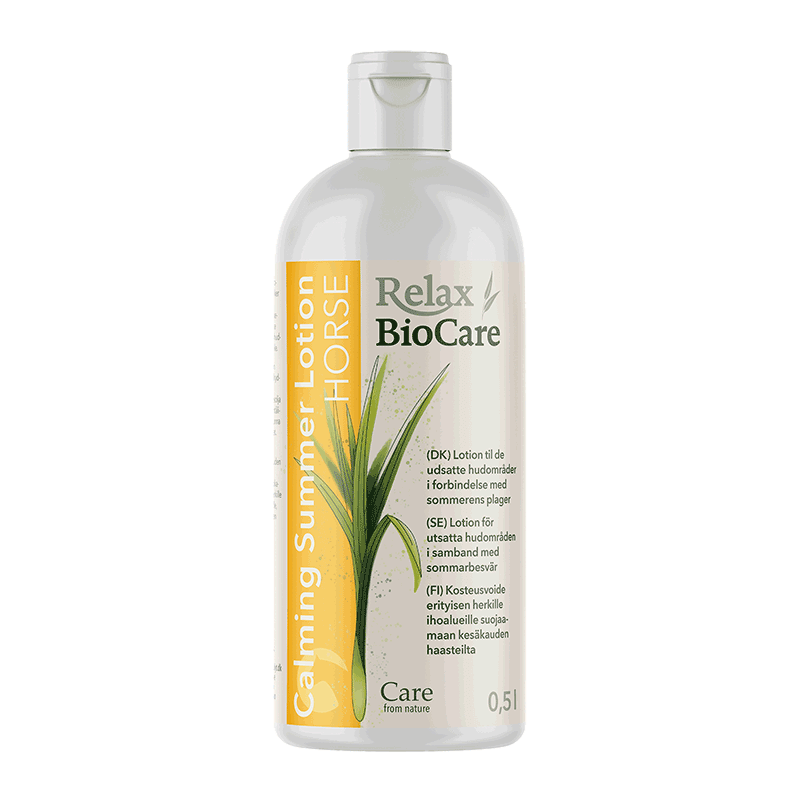 Relax BioCare – powered by St. Hippolyt Til sommerens plager lotion til de udsatte hudområder i forbindelse med sommerens plager særlig god til heste, der ikke bryder sig om spray behagelig duft Calming Summer Lotion er en hudplejende lotion med indholdss