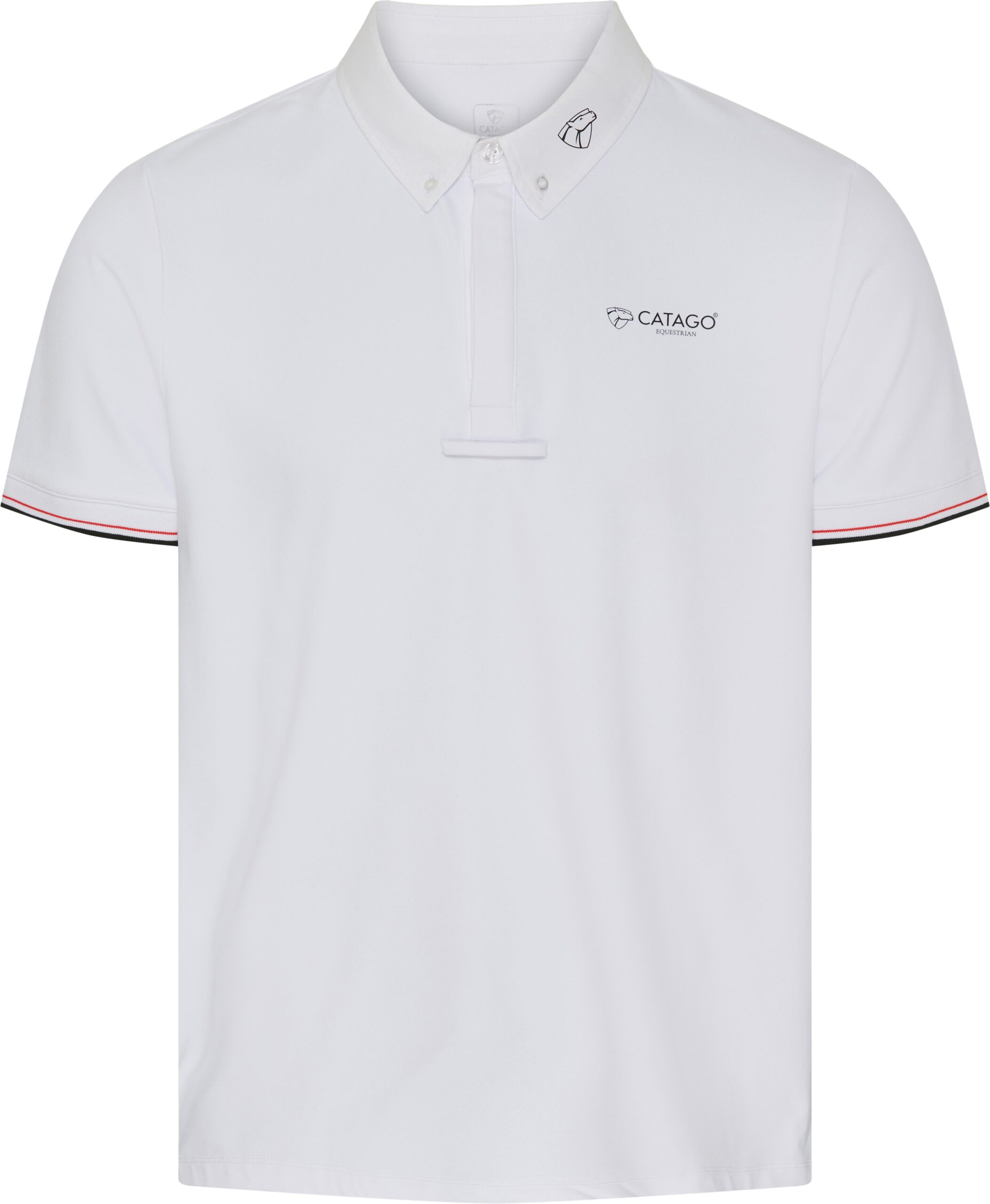 Hvid polo stævnebluse til herrer med korte ærmer og krave med Catago logo. Elegant farvede striber på ærme.
