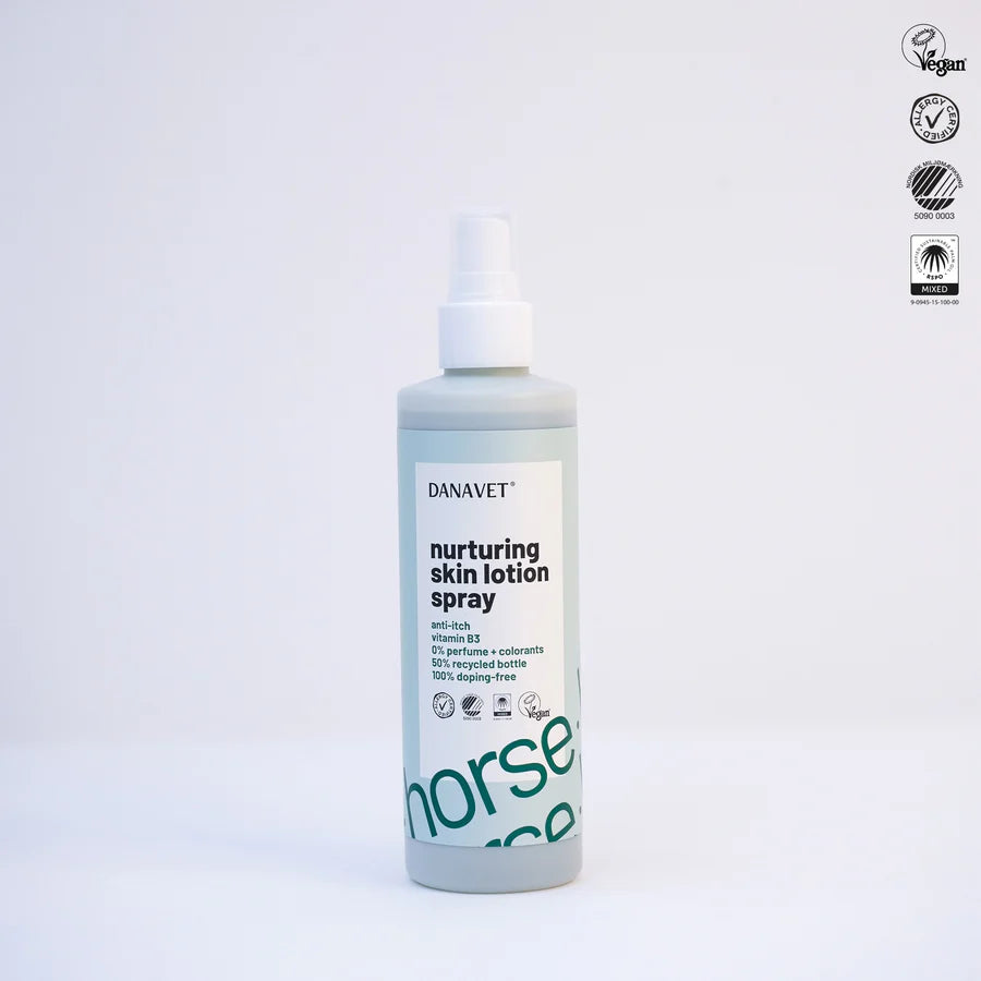 Fugtgivende Skin Lotion spray til heste. Hjælper til genetablering af hudens fugtbalance efter vask, så hestens hud bevarer sin naturlige styrke og pelsen sin glans. Afhjælper kløe plejer og lindre sommereksem Fugter huden Vitamin B3 DanaVet Nurturing Ski