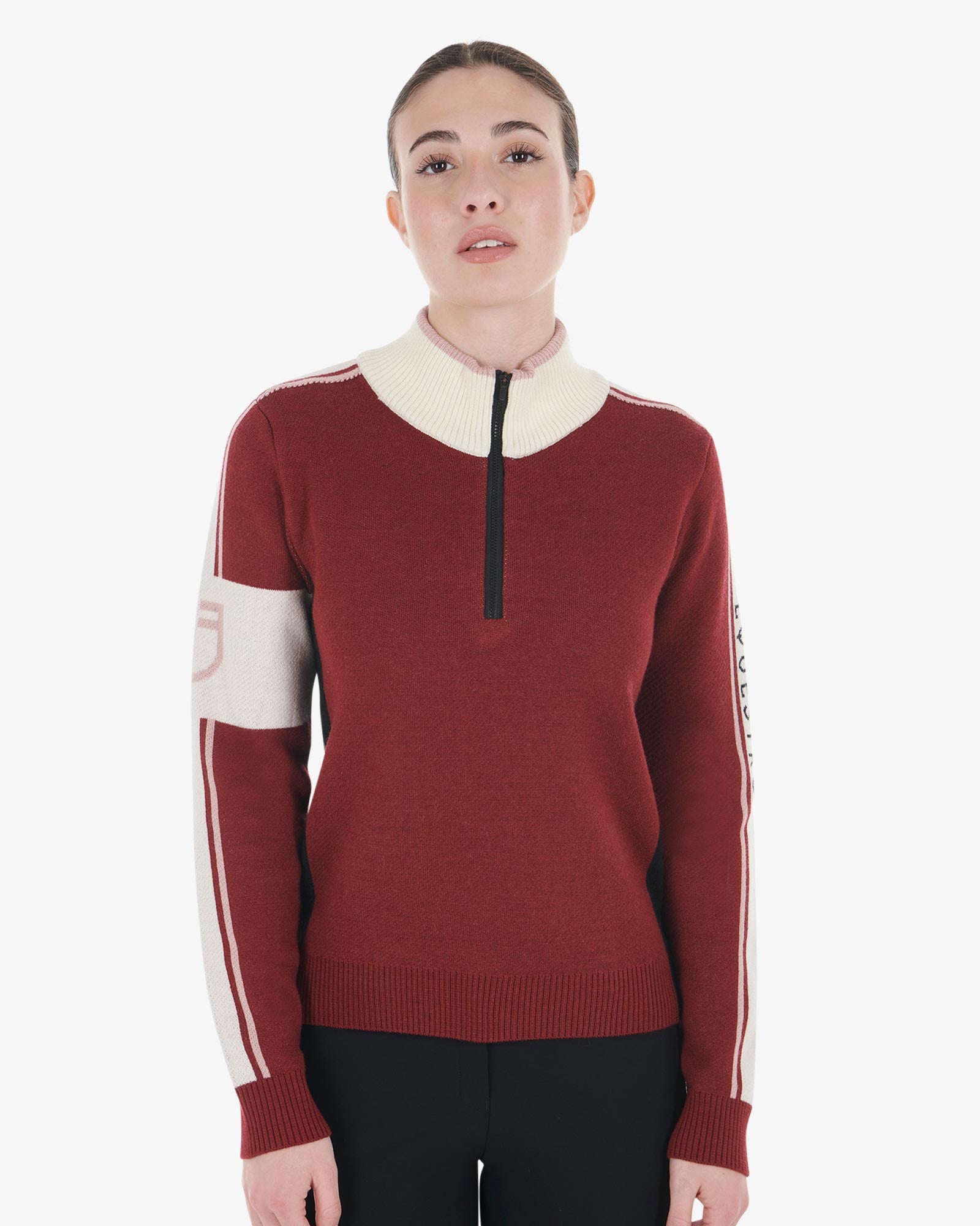 Blød uldtrøje med høj hals til kvinder med lynlås øverst for nem brug og logo på ærmet. Smart sporty design med striber, hals og krave i kontrastfarver.