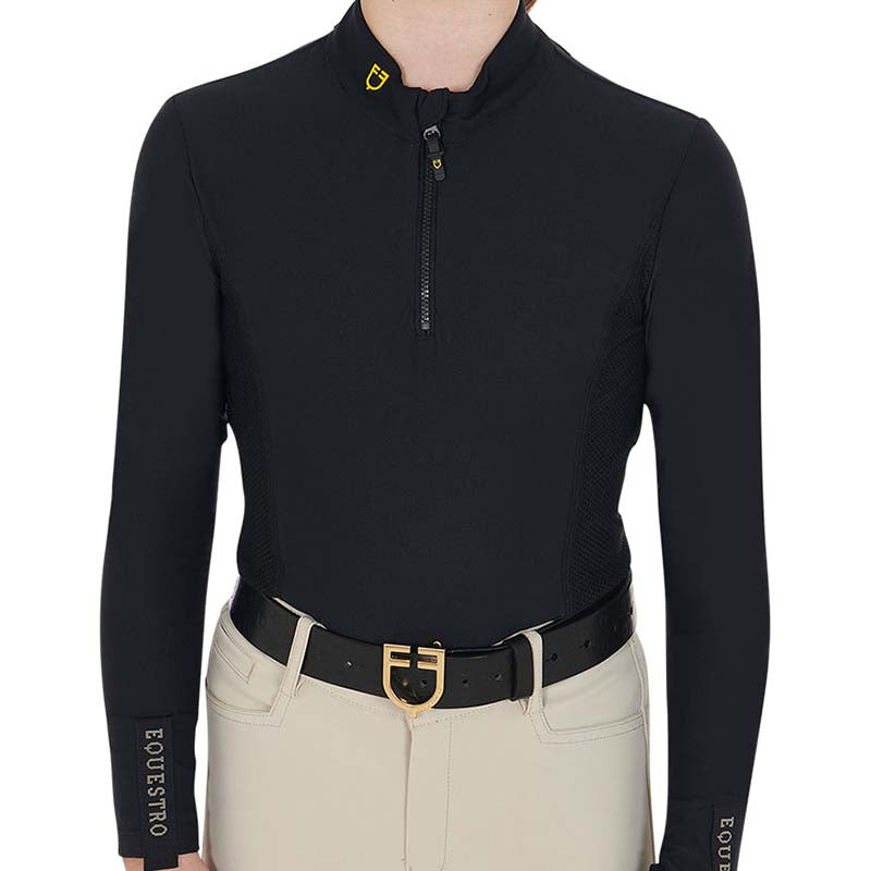Let og åndbar baselayer langærmet trøje fra Equestro. Sort med Equestro logo i gult. Med 1/4 lynlås.