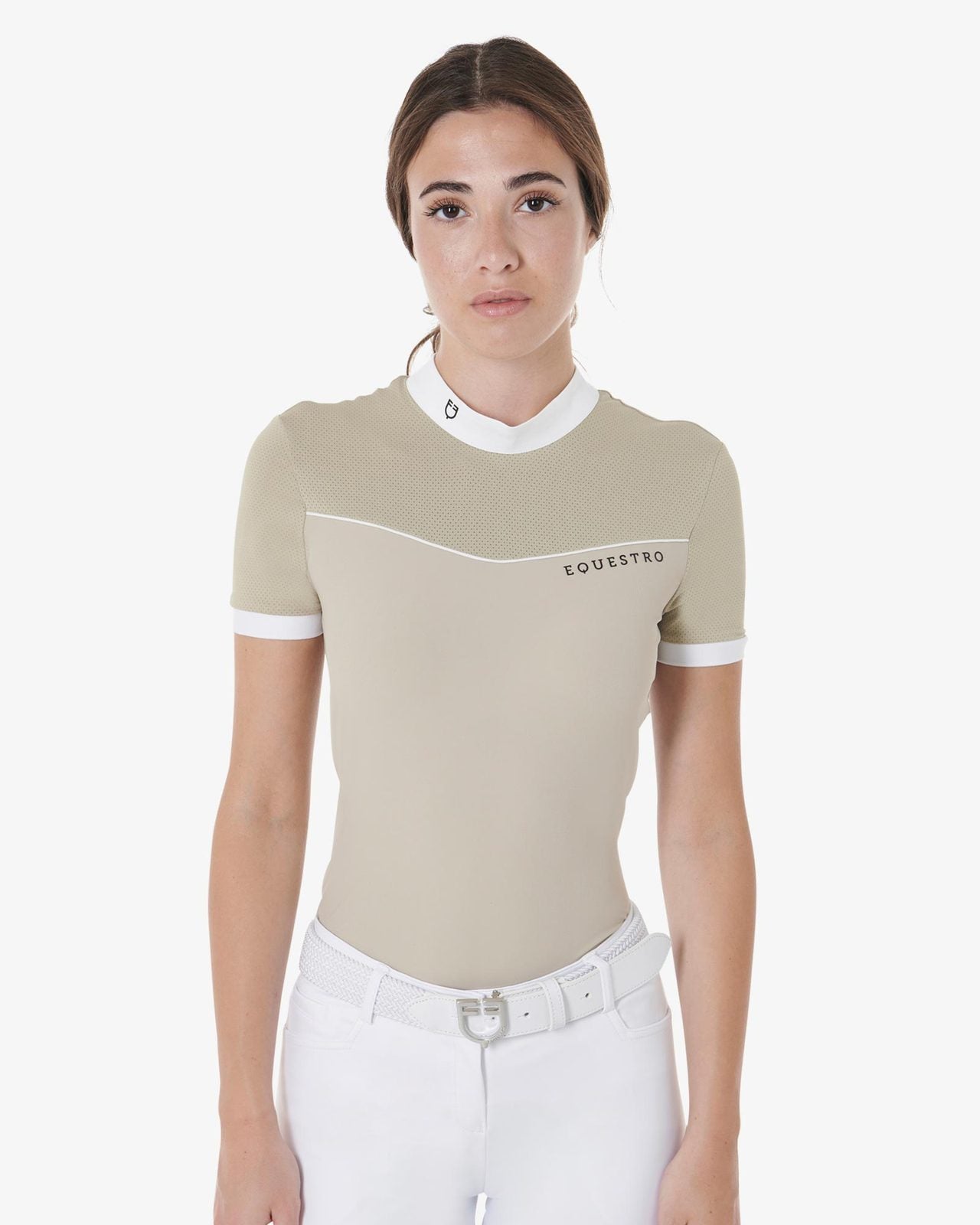 Lækker stævne-polo fra Equestro i slim fit, lavet i teknisk stof med meshstof. Stoffet er af super lækker kvalitet samt meget elastisk, åndbart og temperaturregulerende, hvilket giver en super komfort for rytteren. Det feminine snit gør, at denne t-shirt