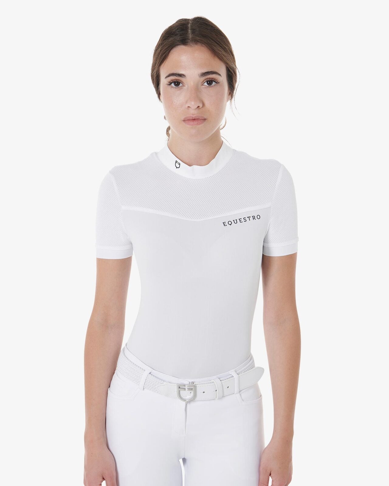 Lækker stævne-polo fra Equestro i slim fit, lavet i teknisk stof med meshstof. Stoffet er af super lækker kvalitet samt meget elastisk, åndbart og temperaturregulerende, hvilket giver en super komfort for rytteren. Det feminine snit gør, at denne t-shirt
