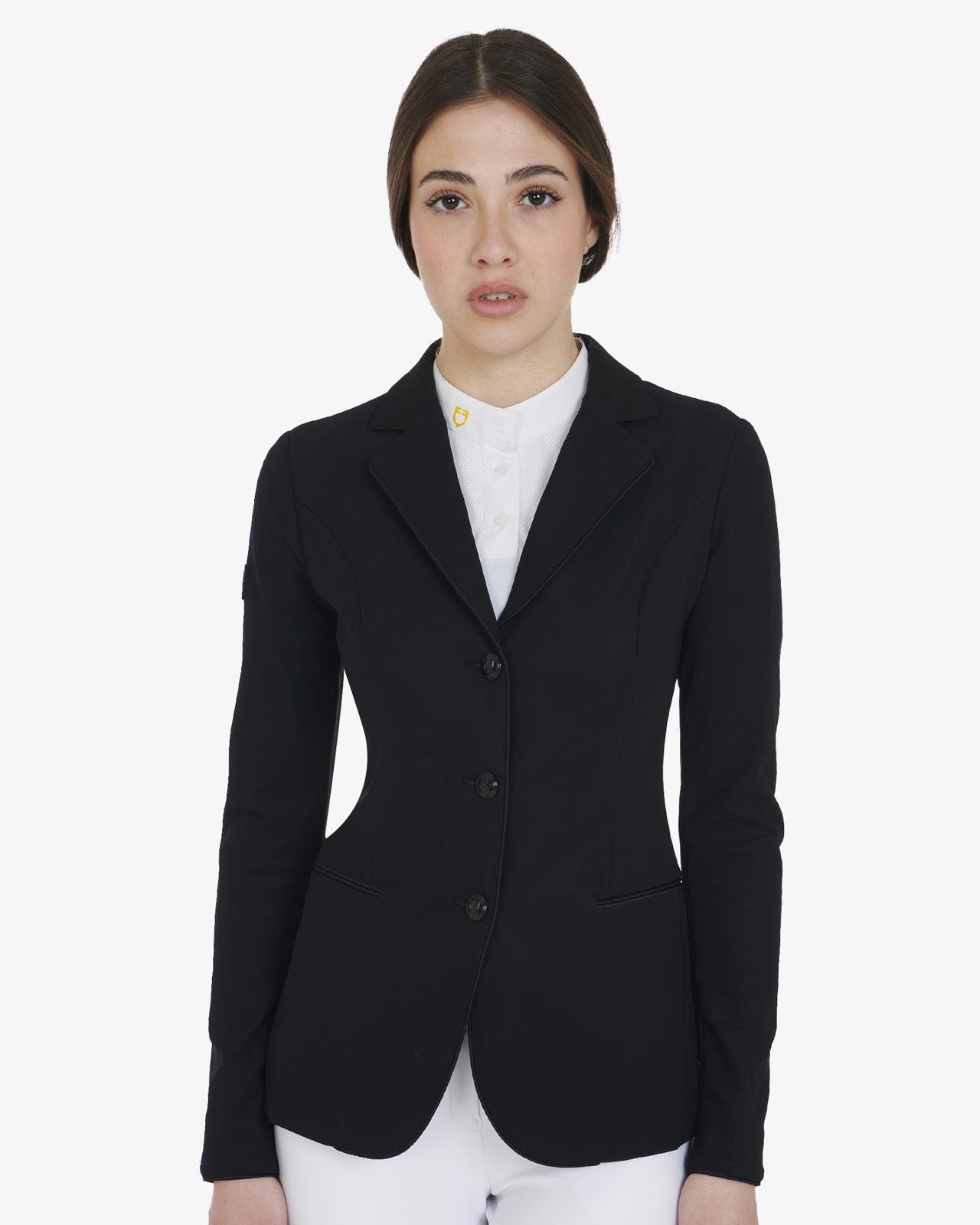 Stævnejakke til kvinder i åndbart og ultralet teknisk stof af fremragende kvalitet.Det anatomiske snit garanterer fremragende pasform, maksimal komfort og bevægelsesfrihed. Jakken kommer med tre knapper, lommer og Equestro logo patch på skulderen.