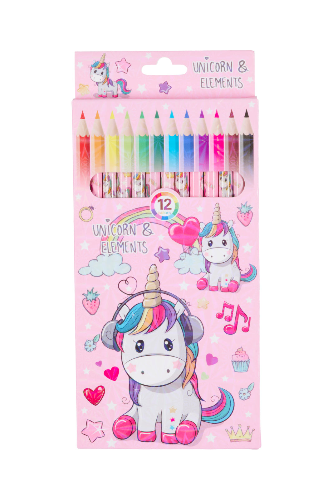 Pakke med farveblyanter med enhjørning-tema. Sæt med 12 dele i en glitrende æske.