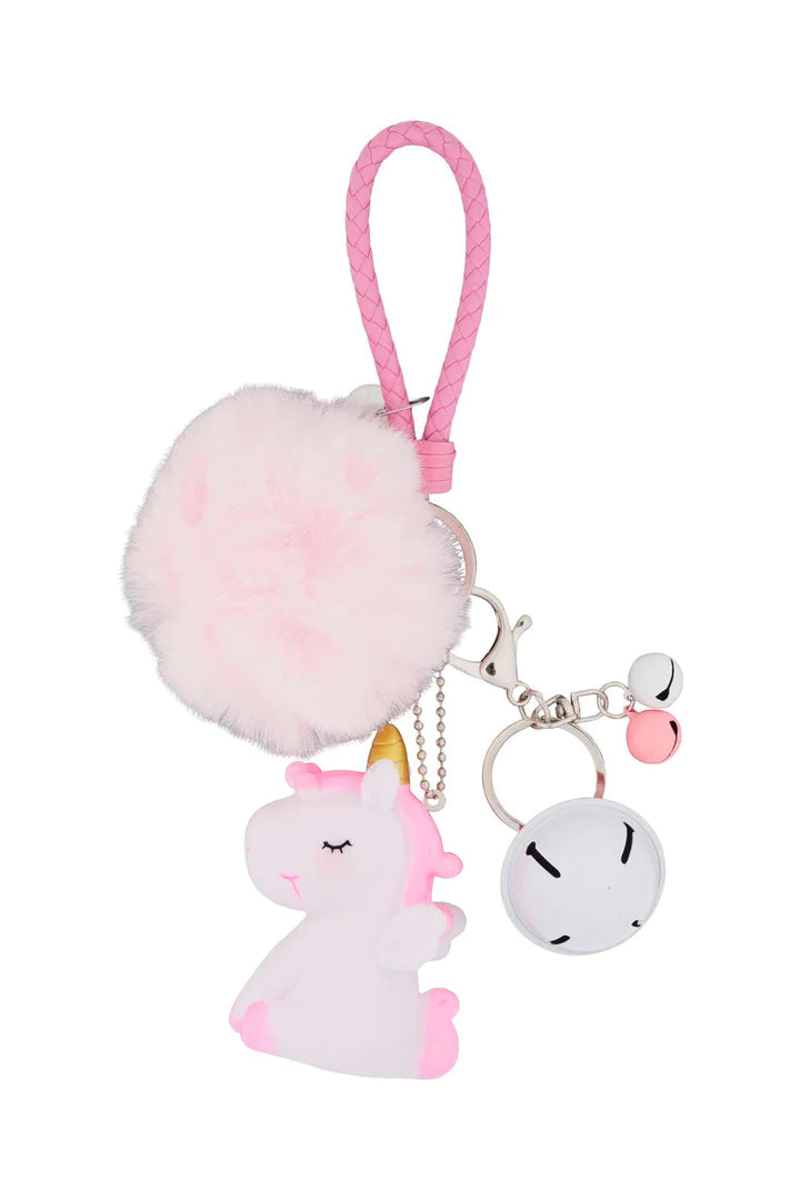 Nøglering til børn med enhjørning i gummi, pompon i kunstpels, små klokker og flettet strop.