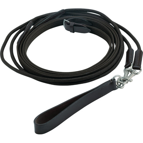 Glidetøjle i webbingmateriale med nylonreb i enderne. Løs læderstrop til fastgørelse om gjorden.