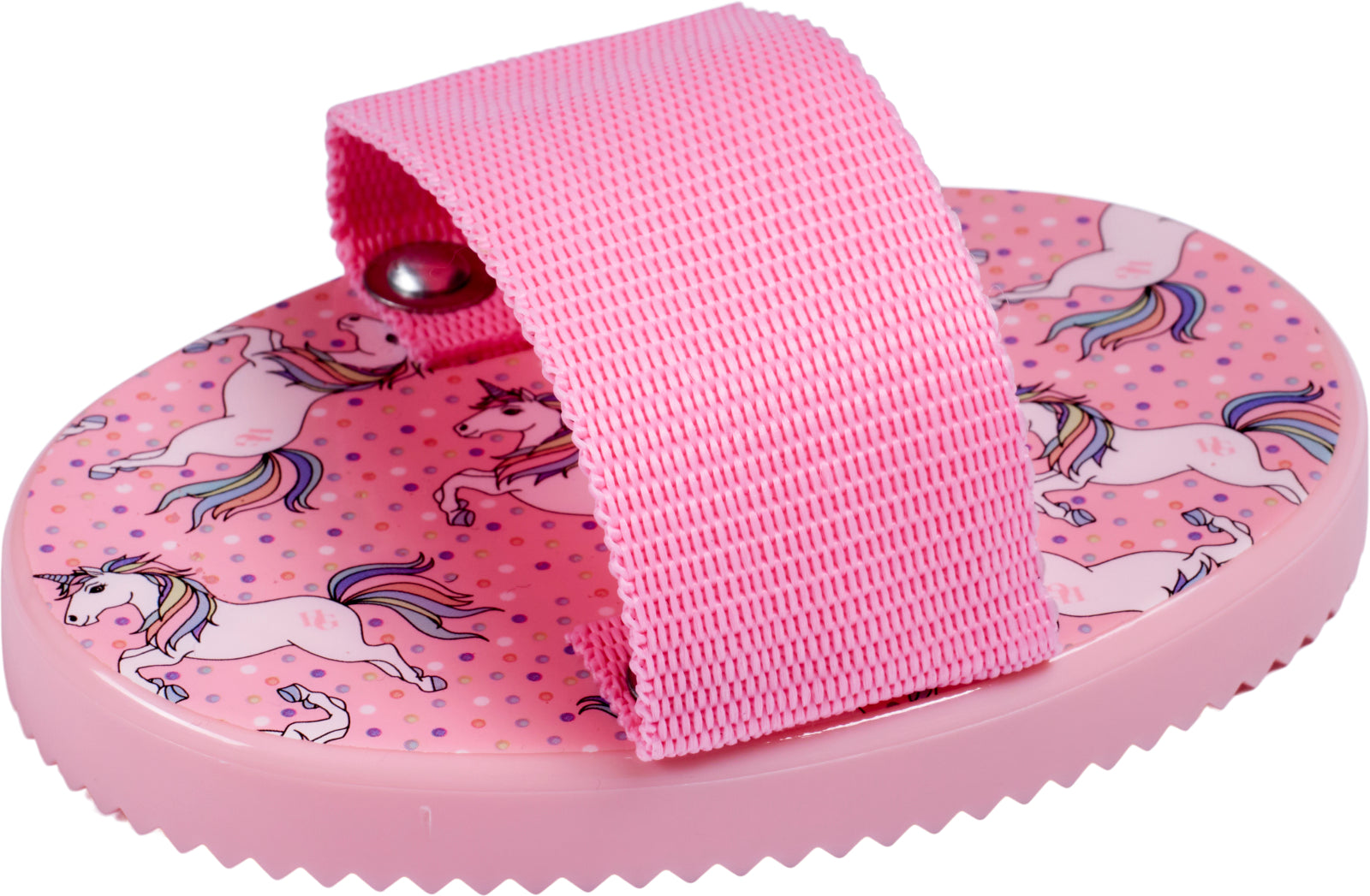 Plastikstrigle til børn med bredt plastikhåndtag. Med tre lag af små plasttænder. Bruges til at fjerne snavs, snavs, hår og sved direkte fra hestens pels. Meget holdbar for at kunne tåle daglig brug. Flerfarvet enhjørningedesign, der passer til resten af