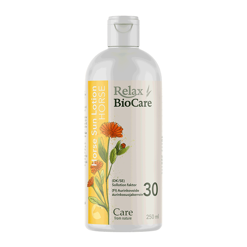 Relax BioCare – powered by St. Hippolyt Beskyttelse mod solen sollotion med faktor 30 til heste med lyse pelsområder, hvide aftegn og lyserød hud behagelig duft Horse Sun Lotion er en sollotion med faktor 30 til de følsomme lyse pelsområder og hvide afteg