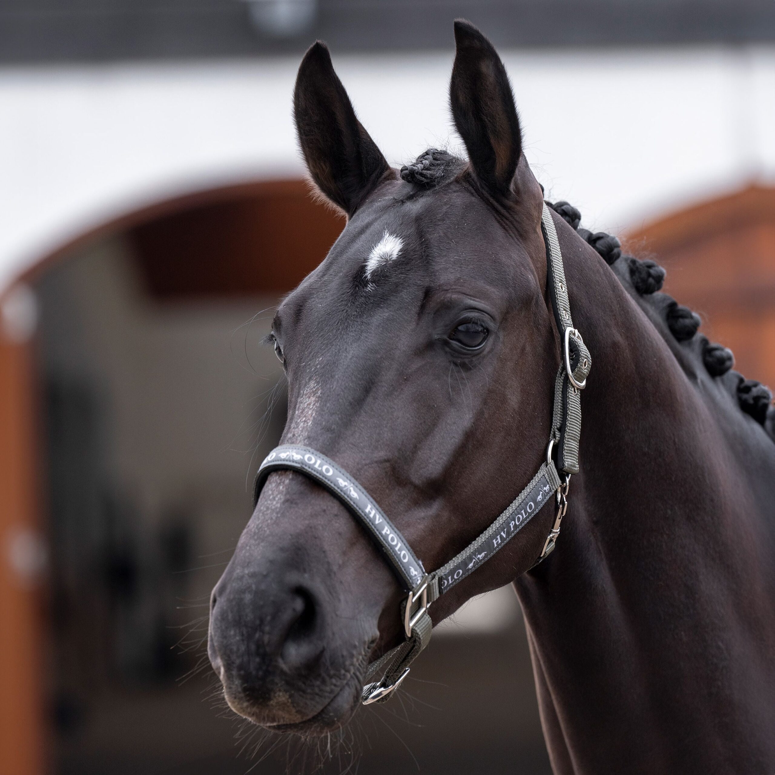 Dette er en basic grime fra HV-Polo med logo tape på næsebånd samt langs kindstykkerne. Den er polstret med neopren forring, så den er dejlig behagelig for hesten at have på. Den er justerbar i næsen og ved kindstykket. Basic grime Logo tape langs næse og