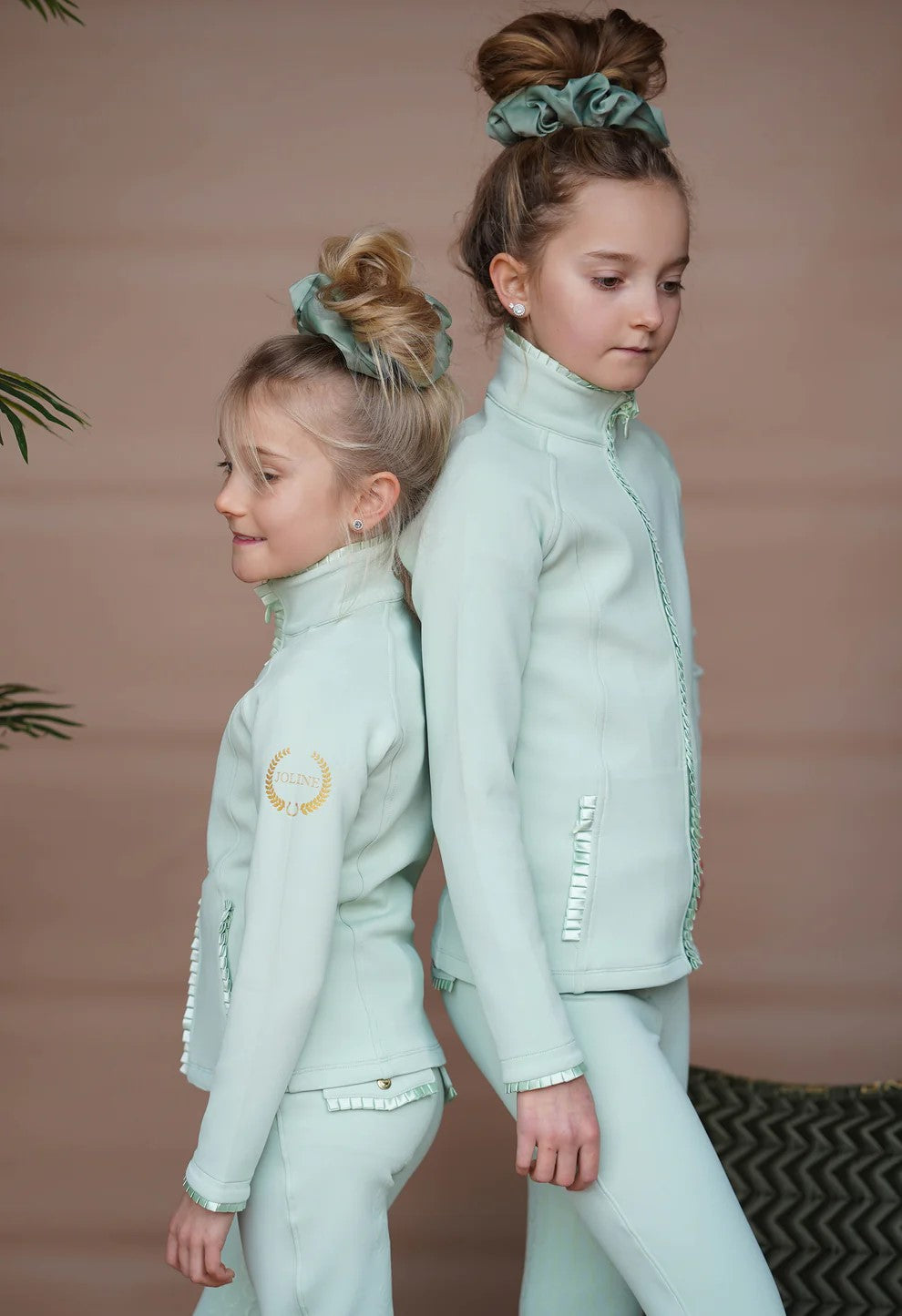 Praktisk og smart cardigan fra Joline til børn. Dette er en super let og behagelig cardigan, da den er lavet i 4-vejs stretch materiale. Den har en gennemgående lynlås samt to forlommer, som er smukt dekoreret med flæser. På venstre ærme sidder Jolines fl
