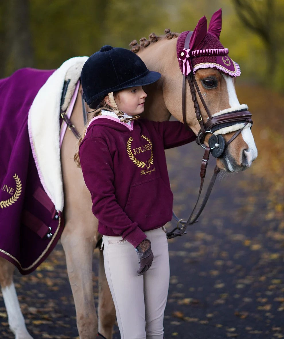 Hættetrøje fra Joline. Denne hættetrøje til børn fra Joline har en behagelig og afslappende pasform. Den er både varm og har en hætte med en stor kængurulomme. Trøjen er smukt dekoreret med “the pony brand” fra Joline, som er broderet i guld på brystet. T