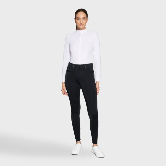Disse eksklusive ridebukser kombinerer luksus og funktionalitet på bedste vis. Med en sofistikeret Swarovski-krystalstoffdekoration, tilføjer de et strejf af glamour til din ridestil. Bukserne er designet med en skjult telefonlomme i linningen og har lynl