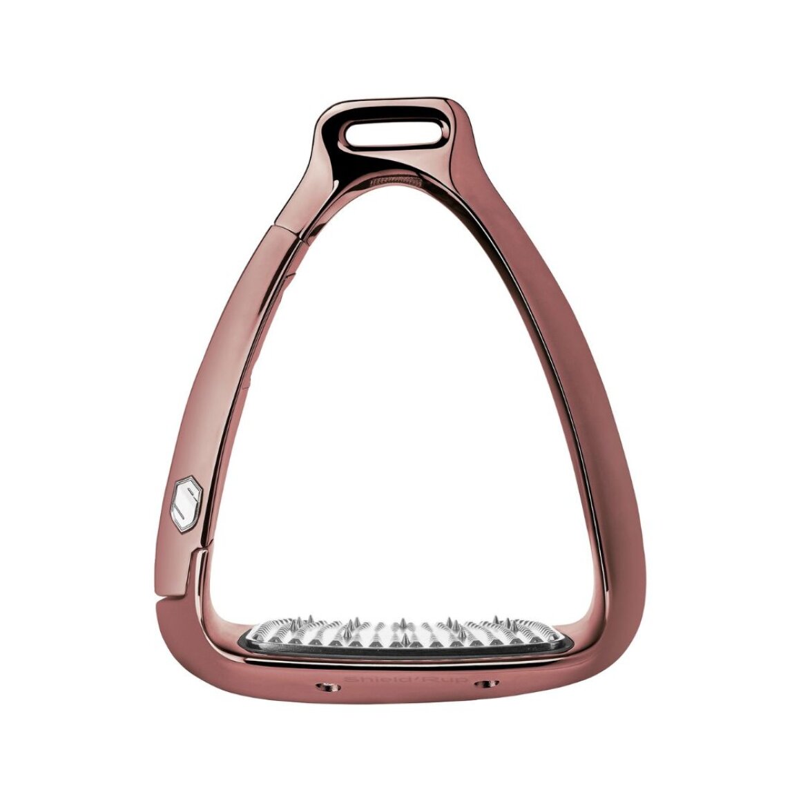 De smukkeste sikkerhedsstigbøjler fra Samshield. Denne i rosegold med metal Samshield logo på fronten. Den tværgående gren af Shield’rup åbnes i tilfælde af pres ved fald fra hesten.