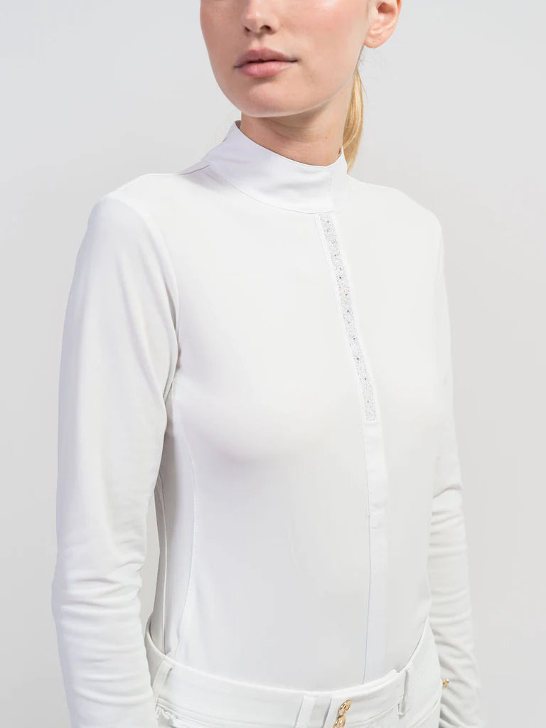 Super flot og elegant stævnetrøje fra franske Samshield. Designet med elegante swarovski krystaller i kirsebærblomst mønster på kraven. Skjorten er lavet af materialer af høj kvalitet og tilbyder enestående åndbarhed, stretch og komfort for ryttere.