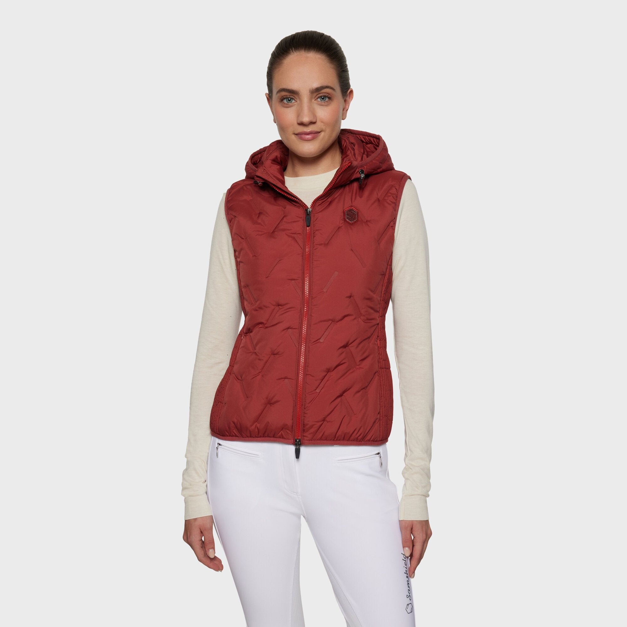 Elegant og moderne vest med tone-i-tone lynlås, usynlige lommer, ultralydssvejsede sømme og en aftagelig hætte. Fuldendt med en glitrende Swarovski detalje på brystet.