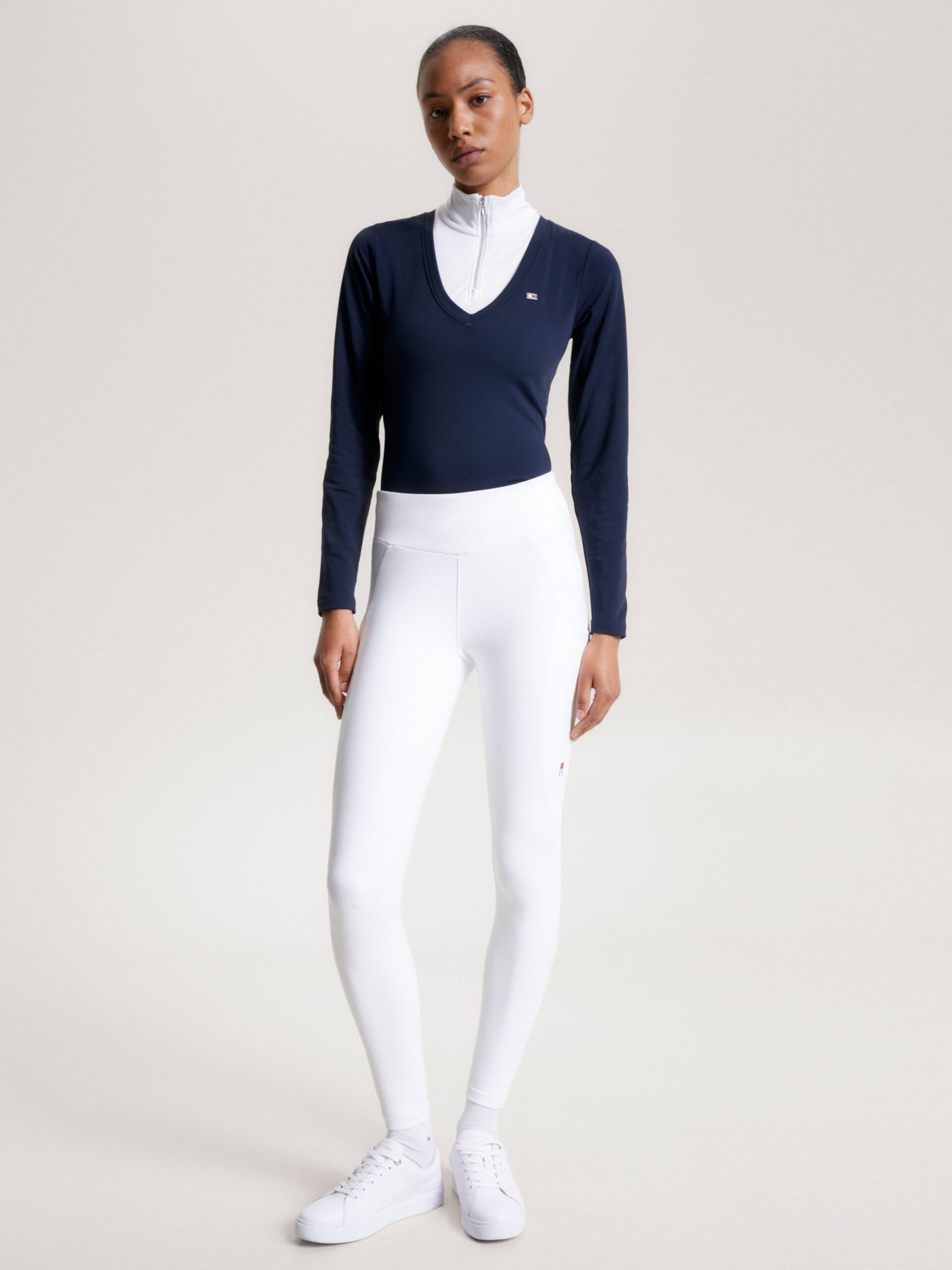 Lækre og varme super stretch thermo leggings med et bredt v-formet bælte, som giver perfekt tilpasning. Smart mobillomme i højre side og Tommy Hilfiger Equestrian mærke og logo på venstre side og indvendigt i bælte.