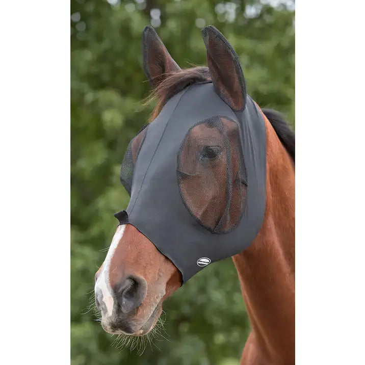 Weatherbeeta flue maske med stretch, er designet med lækkert stof med masser af stræk og behagelig mesh ved øre og øjne. Denne maske kan lukkes med lynlås og har et hul til pandelokken. Med en super pasform til hestens hoved, beskytter den mod insekter og